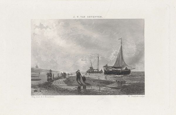 Alexandre Joseph Boens made this lithograph called 'Scheveningen after the storm' in 1825. It portrays a North Sea beach in the Netherlands, with fishing boats lined up after a storm. The scene is full of people, suggesting a community recovering and returning to normal life. The artwork reflects the social and economic importance of fishing in 19th-century Dutch coastal communities. Boens likely aimed to capture a realistic scene of daily life, a common theme in Dutch art. The lithograph medium allowed for mass production and wider distribution, fitting the desire to depict everyday scenes for a broader audience. The church in the background could signify the importance of religion in providing solace and stability during turbulent times. To fully understand this work, historians would examine local archives, newspapers, and other visual sources. These might give us a glimpse of the artist's background, the fishing industry, and the societal impact of storms and economic hardship.