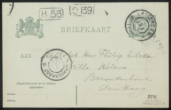 This "Briefkaart aan Philip Zilcken" offers us a glimpse into the late 19th-century Dutch art world through a simple means of communication. Eduard Karsen, the artist, sends this card to Philip Zilcken, likely a fellow artist or art critic, against the backdrop of a rapidly modernizing Europe. The act of sending a briefkaart itself speaks to the burgeoning culture of correspondence and networking among artists. The handwritten address, complete with a stamp and postmark, highlights the personal touch that was characteristic of communication before the digital age. The card is both intimate and functional, a means of connecting within a specific social and intellectual circle. Consider the emotional weight of such an exchange, a tangible connection between individuals navigating their roles in a society undergoing profound change. It embodies a sense of community and shared experience, hinting at the networks that supported artistic endeavors during this transformative era. This briefkaart is a reminder of the personal connections that underpin artistic movements and the emotional investments that artists make in each other's lives.