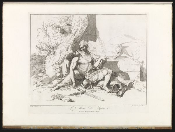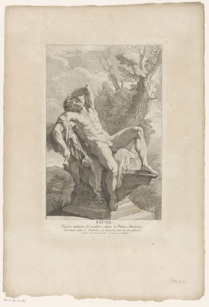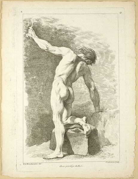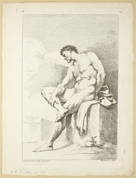 This figure study, etched by Pierre Aveline, presents a male nude seated upon rocks, a classical motif echoing throughout art history. The seated pose, often associated with melancholy or contemplation, finds its roots in ancient depictions of philosophers and gods. Consider Michelangelo’s figures of the Medici Chapel, for instance. There, the seated posture embodies profound reflection and a sense of worldly burden. Such postures have been used to convey introspection or sorrow, emotions that echo in Aveline's figure, whose downcast gaze suggests a deep internal struggle. This gesture reminds us of figures like the grieving Mary Magdalene, whose posture conveys intense sorrow. These reappearances are not mere coincidences but reappearances of human emotions, etched into our collective memory. The figure's posture engages viewers on a subconscious level, resonating with our shared experiences of introspection and vulnerability. In the cyclical progression of symbols, a single pose can carry the weight of history, evolving and resurfacing to reflect the ever-changing human condition.