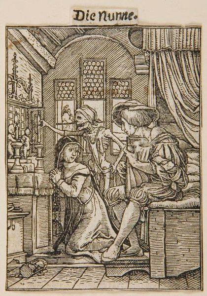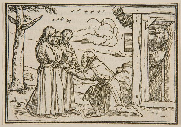 Curator: This is Hans Holbein the Younger's "Hannah's Prayer," currently held at the Harvard Art Museums. Editor: It’s striking how stark and linear the woodcut is; the light and dark contrasts emphasize the figures. Curator: Absolutely. The story of Hannah, from the Book of Samuel, resonates deeply through the visual language Holbein employs, a woman's earnest plea for a child. Editor: I notice the heavy lines forming the clothes and architectural setting. Holbein's choice of the woodcut seems intentional; the starkness mirrors the labor of childbirth itself. Curator: The faces, though, carry such emotional weight. See Hannah's clasped hands, the downward gaze - symbolic of supplication and reverence. Editor: Yet, the labor isn't solely Hannah's; the craftsman's process, the carving, the printing—all contribute to this powerful visual experience. Curator: Indeed, the image acts as a mirror reflecting not just a biblical narrative but also the societal hopes and anxieties surrounding fertility and legacy. Editor: So, this print's existence bears witness to both the religious story and the labor behind image-making at the time. Curator: Precisely. Each element conveys layers of meaning. Editor: It makes you think about all the hands involved to realize a single image.