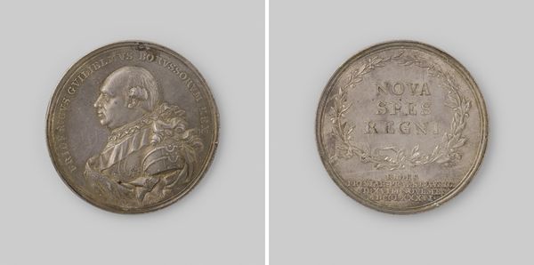 Curator: The first thing that strikes me is the contrast – it's almost like two little worlds, isn’t it? Such formality and then almost...a rural depiction? Editor: Absolutely! This is a medal from 1741 by Theodorus Everardus van Berckel, created to celebrate the construction of a new paved road between 's-Hertogenbosch and Eindhoven. The medal’s made of metal, likely silver, worked in relief and engraving. Curator: Yes, one side showing the town with lovely detail and little boats, life happening – then flip it over and boom! Hermes strides forth bearing gifts, or at least, holding the caduceus as if about to solve everyone's minor ailments and maybe some slightly bigger trade deals? He's practically skipping out of that horn of plenty. Editor: That's a fantastic reading! The side with Hermes is loaded with symbolism. Hermes, of course, is the god of commerce, but note that seated female figure to the right: she’s an allegory for the city of 's-Hertogenbosch, indicated by her coat of arms resting at her side. "PERFICERE URGET" proclaims the inscription around them which translates to "to accomplish urges" clearly referencing the energetic drive needed to complete this monumental infrastructure project. Curator: Infrastructure euphoria, now that's an emotion I can relate to. The little blocks he seems to be stepping over give such a charming sense of perspective too. Though that horizon line of 's-Hertogenbosch itself is strangely flat on the other side, a sort of picturesque bird's-eye squint... Editor: Indeed, the contrast is quite stark. That landscape view on the other side is dominated by text and, let's be honest, looks pretty crammed together. However, you do get that clear announcement saying Sylva Ducis – the Latin name for the city, below the neat skyline... Curator: ...Sylva Ducis! Forest of the Duke! I love how official and also utterly whimsical that sounds simultaneously, as opposed to how it looks. One would almost forget it's a pretty industrious Dutch city! I feel the weight of time simply through seeing them combined on such a miniature surface. Editor: Right? The visual weight each symbol carries – from the Roman lettering to the Dutch cityscape – offers this compressed history in your palm. These medals acted as memory keepers – to celebrate events or signal pride in community progress. Looking at this Baroque work is like holding tangible cultural memory. Curator: What a beautiful way to put it. I feel almost implicated by that upward urging of "PERFICERE URGET", as though a to-do list is etched in metal on reality itself. It's a neat reminder that even celebrations often carry work ethics in them! Editor: Precisely, perhaps that shared ambition echoes through centuries, uniting us with those people from the Forest of the Duke? It invites contemplation and awe across epochs, it speaks.