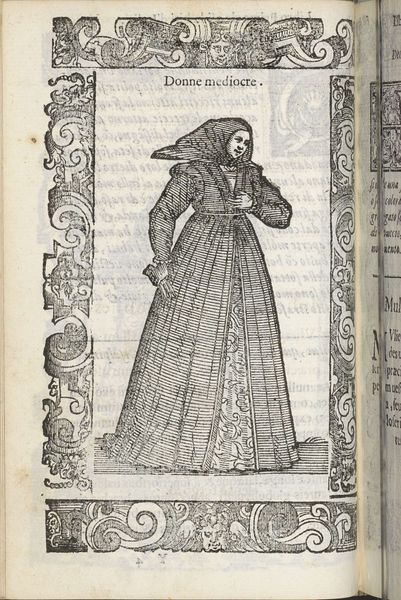 Curator: Looking at this drawing, “Plebea Genovese,” by Christoph Krieger from 1598, what’s your immediate take? Editor: There’s an interesting tension here. On the one hand, the meticulous detail, particularly in the woman’s dress, is captivating. However, the rigid lines and somewhat flattened perspective feel… constrained. Curator: Krieger created this work as part of a broader cultural trend—artists seeking to document and categorize various social classes. Think of these "genre paintings" as early forms of sociological observation. The "Plebea Genovese" represents a commoner from Genoa, her dress reflecting her station in life. Editor: Yes, and it’s interesting how the patterns of her skirt create a striking visual rhythm, directing our eyes downwards, and that little satchel, dangling so casually, breaks that otherwise rigorous ordering of form. The pen strokes used here remind me of architectural drafting, which aligns with that almost scientific attempt at categorizing and documenting life. Curator: Exactly! Krieger, in essence, used the printing press to disseminate information, shaping perceptions about different people across geographic and social divides. And there’s a deliberate contrast with the ornateness surrounding her image, a frame decorated with classical motifs, seemingly elevating the subject even as it marks her as ‘other.’ Editor: The face, though… I find it quite neutral. A lack of emotion. Could this be Krieger focusing on the clothes as semiotic tools? The dress tells us more about the figure than the figure tells us about the person? Curator: I agree. The print serves as a record, but it also inevitably perpetuates stereotypes, defining this woman not by her individual personality, but by her clothing and class. These early depictions influenced how people perceived each other and how society was structured. Editor: Fascinating. It highlights the formal control exerted over representation and how meaning is encoded not just in what is shown but how it's presented and circulated. Curator: It provides a stark lesson in the power of visual culture, its potential to both illuminate and to reinforce power structures. Editor: Definitely food for thought, next time I’m assembling an image for a publication.