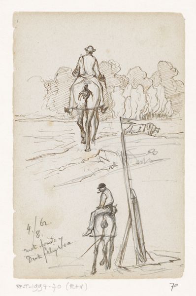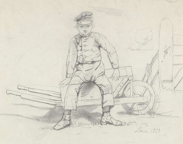 Curator: Looking at this landscape drawing by Martinus Rørbye, titled "Mountainous landscape with a church," dating back to 1835, it feels immediately like stepping into a sun-drenched daydream, doesn't it? All shimmering water and distant hills. Editor: Indeed, what's compelling is Rørbye’s emphasis on process; this isn’t a finished painting destined for a salon, but rather an intimate pencil drawing. You can almost hear the scratching of lead on paper, sense the artist capturing the immediacy of his surroundings. Curator: Absolutely! It's a romantic snapshot. See how he's perched the figure, almost casually, against that backdrop of hazy mountains? It whispers of freedom and exploration. It reminds me a little bit of Kerouac. I wonder, was it just a study, or was it trying to capture the immensity of nature, a divine spark in the ordinary? Editor: The bare materiality of the pencil suggests its own narrative. Consider Rørbye’s choice to draw such a vast, idealized scene using such humble materials—the very tools of early industrial labor. And consider that the ‘romanticism’ is consumed now as something of great worth displayed on museum walls; it invites us to question how objects become valuable. Curator: A beautifully grounded thought. It does offer this raw, sketch-like glimpse behind the curtain. It invites you into his process. Did you ever feel like you're capturing a lightning in a bottle when creating? It's almost a compulsion to transcribe and express before the moment flees. Editor: The real jolt is the visible trace of work. The ‘divine’ is not purely aesthetic but woven through production itself: sourcing the materials, honing craft, sketching lines to communicate meaning. That shifts our perspective. Curator: Well, it makes me reflect on my appreciation and my work itself. The simple act of pausing and really *seeing* something... It feels incredibly profound sometimes, doesn't it? Editor: Precisely, an art that comes alive precisely through our attentiveness, through an acute consideration of its conditions of being and becoming.