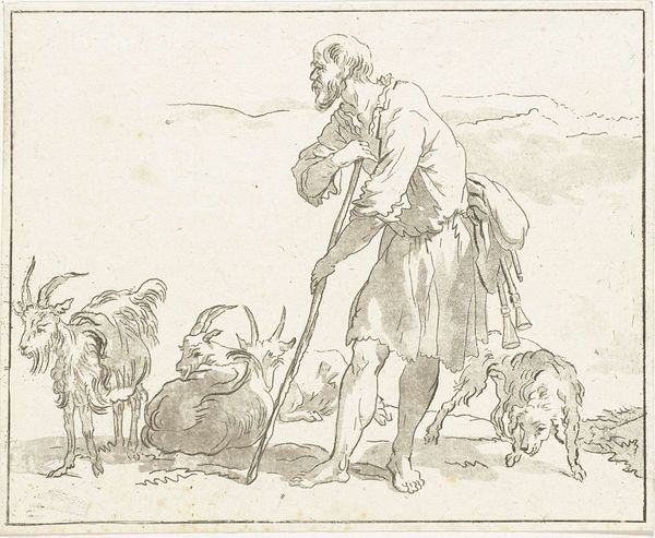 Editor: We're looking at "Landschap met een jachtgezelschap," or "Landscape with a Hunting Party," a pencil drawing on paper made by Johannes Tavenraat around 1843-1844. It feels very stark, almost unfinished, with these figures so isolated on the page. How do you interpret this work, especially within its historical context? Curator: That “unfinished” quality is precisely what strikes me. Consider the historical moment: the 1840s. The Romantic era is wrestling with ideas of man’s place in nature, often glorifying it. Yet, this drawing subtly undermines that narrative. We see figures engaged in a traditionally upper-class pursuit – hunting – but they appear almost caricatured, lacking nobility. It almost looks satirical. Editor: Satirical? That's interesting. The clothing seems fairly accurate for the period. Where's the critique coming from? Curator: Look at the dogs. Hunting dogs were bred for specific purposes. Their use embodies a deliberate power dynamic: humans exploiting animals for sport and the economic structures supporting this lifestyle. Tavenraat seems less concerned with romanticizing the hunt than exposing its constructedness. Ask yourself, what anxieties about class, land ownership, and human control over nature might Tavenraat be subtly engaging with here? Is it truly a landscape, or a social commentary disguised as one? Editor: I hadn't considered that reading, focusing on the dogs and the act of hunting as a point of tension. Seeing it as less about nature and more about the social hierarchy *within* nature is revealing. Curator: Exactly. Art provides a mirror to societal values. This understated sketch invites us to interrogate those values. The seeming emptiness of the background and the lack of dramatic detail actually forces the viewer to complete that social story of nature. Editor: Thanks. Now, when I look at it, it's unsettling but powerful, seeing the historical critique. Curator: It's precisely this sort of intersectional analysis that makes engaging with older art relevant to modern life.