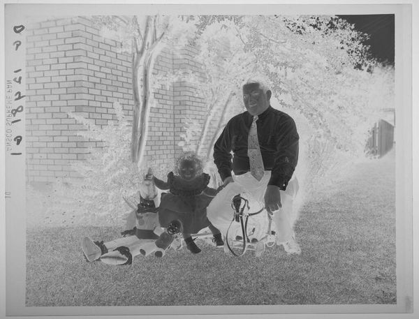 This photograph, by Paul Gittings, captures a family with new toys, likely taken around the mid-20th century. The image itself is created through the chemical processes of photography, a technology that democratized portraiture, once the domain of painted elites. Here, the family is posed stiffly on their lawn, surrounded by consumer goods. The material reality of mid-century America is subtly present. The new toys suggest an increasing emphasis on childhood and the nuclear family, alongside the growth of consumer culture. The photograph immortalizes a fleeting moment, but also speaks to broader social trends. The image's starkness, due to it being the negative, underscores the constructed nature of the scene. It reminds us that even seemingly candid snapshots are carefully composed, reflecting both individual aspirations and collective ideals. By considering the material and social context of this photograph, we gain a deeper understanding of its cultural significance, challenging the traditional distinctions between personal memory and broader historical narratives.