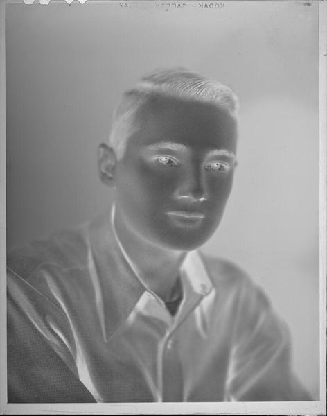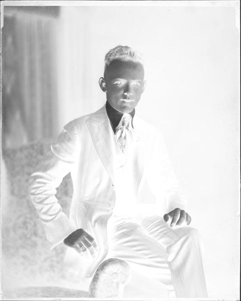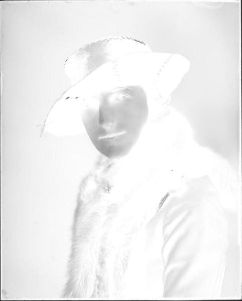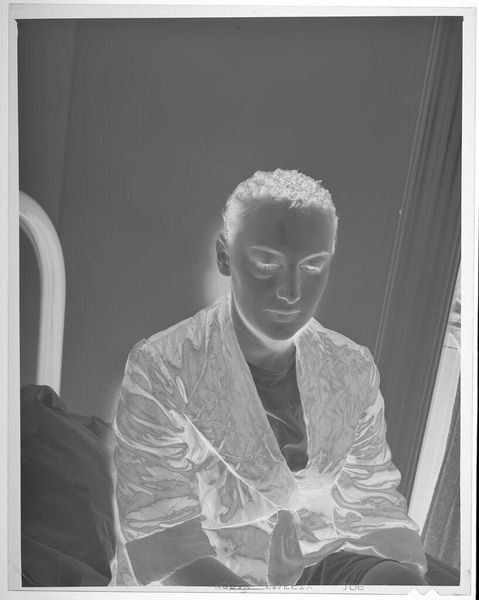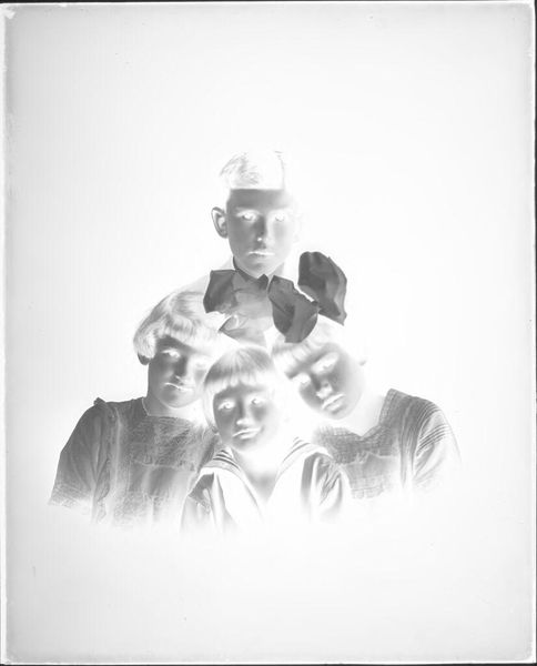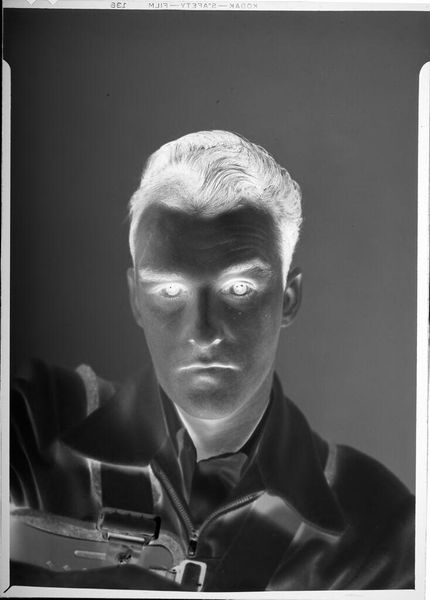 Editor: This is an untitled portrait of a young man with a pipe by John Howell. It's a small photograph, only about 5 by 4 inches. The high contrast creates such a striking image. What visual elements stand out to you? Curator: The stark contrast between light and shadow immediately draws the eye. The composition emphasizes geometric forms: the cylindrical pipe, the sharp lines of the collar, juxtaposed with the soft curves of the face. Note how the tonal inversion alters our perception of texture, creating a somewhat ethereal quality. Editor: Ethereal, yes! I see that now. The shapes and lines really do create a sense of drama. Curator: Precisely. The artist manipulates light and form to create an image that transcends mere representation. The negative space becomes as important as the subject itself. Editor: That’s fascinating. I hadn’t considered the negative space. Curator: By examining the interplay of formal elements, we gain insight into the artist's intent and the photograph's deeper meaning. I encourage you to look at other works and see what is foregrounded. Editor: Thank you. I will definitely pay more attention to the shapes and the light.