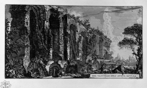 Curator: This is a plate from Giovanni Battista Piranesi's "The Roman Antiquities," specifically Volume 1, Plate XVII, depicting the Aqua Claudia. It was completed in 1756, and what we're seeing here is an engraving. Editor: My immediate response is awe. It feels both imposing and delicate. The ruins dominate, yet the delicate lines of the engraving give it an almost ethereal quality. It seems to capture both the grandeur and decay of Rome simultaneously. Curator: What strikes me is Piranesi's process. The creation of an engraving like this, think about the labor, the carving into the metal plate, the repetitive printing. It speaks to the sheer volume of visual documentation he wanted to produce about Roman architecture and how it functions. The distribution, too, speaks volumes: these prints allowed others to access Roman splendor. Editor: I am more struck by how Piranesi uses symbols here. He’s showing us a powerful aqueduct, a literal life-giving artery of the Roman empire, now in ruins. Consider how it served as a testament to Roman engineering and dominance, but seeing it broken conveys ideas of fragility. Time’s passage makes us reflect on power. The symbolic cloud is quite ambiguous. Curator: Yes, but note the detail etched in the foreground where there appear to be common people wandering amidst the ruins, juxtaposing the aqueduct with scenes from the eighteenth-century existence; this really emphasizes the consumption of these historical remnants. Tourism transformed this location; we see evidence of that industry in the piece's deliberate, picturesque style. Editor: Perhaps he intended to evoke the weight of history but it has me focusing on nature’s resilience; the arches of the aqueduct feel like skulls with foliage bursting out. Even decay is beautiful in its way, a symbol of ongoing regeneration and the eternal cycle of things, and Piranesi, by depicting these images, almost places a personal symbolic "stamp" over their images for his patrons to see! Curator: A brilliant point, reflecting that labor produces meaning, always circulating with time and trade. The artwork helps illuminate Rome as more than an aesthetic source for paintings. Instead, it exposes material resources for architects, travelers, and builders. Editor: A collaboration and dialogue between epochs if you will. These are compelling angles which create enduring appreciation!