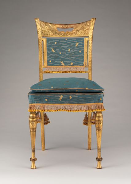 Editor: We're looking at a "Side Chair" by Herter Brothers, made sometime between 1865 and 1875. It's currently housed in the Metropolitan Museum of Art. It's made with wood and what looks like mixed media and gilding. The gold leaf paired with that teal fabric gives off such a formal vibe. What stands out to you when you examine the chair? Curator: The immediate formal quality I perceive arises from its restrained verticality and precise symmetry. Consider the careful placement of decorative elements: the repeating motifs of gilded foliage, the oval inset, even the fluted legs – all contribute to a visual harmony. How does the relationship between these decorative elements and the overall structure affect your understanding of its function as a chair? Editor: I guess I hadn’t thought about how the decoration relates to the structure itself. Now I see how the eye is drawn upwards, accentuating the vertical lines, almost diminishing its functionality. It becomes more of an art object than something to sit on, perhaps. Curator: Precisely. Consider how the gilded details function as framing devices, drawing attention to particular structural elements, thus reinforcing a sense of order. Does this calculated ornamentation alter your perception of its materiality, the way the wood seems almost subservient to the surface embellishment? Editor: It does. The gilding definitely elevates the wood, almost obscuring its natural qualities. I'm starting to see how every choice reinforces that initial formal impression. Thanks, I see the work in a completely different light now. Curator: And that interplay between form and function, materiality and ornament, offers a rich avenue for further formal investigation. This initial visual analysis lays the groundwork for a more contextual understanding of the Herter Brothers' artistic practice.