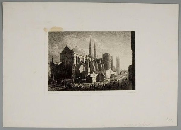 Curator: Thomas Higham’s rendering of Ely Cathedral presents a study in light and shadow. The architecture dominates, but notice the figures in the foreground. Editor: It’s wonderfully bleak. All of that emphasis on the cathedral looming over what seems like a vulnerable populace. Curator: Vulnerable, perhaps, but also integrated. Higham focuses on the geometric precision of the architecture, which reflects the cathedral's role in civic life. Editor: But what about the way this image was distributed? Was it meant for everyone? Prints like this served to create and reinforce class distinctions in the 19th century. Curator: True, but consider how Higham’s use of perspective draws our eye directly to the cathedral’s West Tower, emphasizing symmetry and order. Editor: It’s difficult not to see the hierarchy inherent in the composition—the powerful church against a somewhat faceless group of people. Curator: I see an intersection between the sacred and the secular, rendered with remarkable detail. Editor: I see a document of power and its visual strategies.