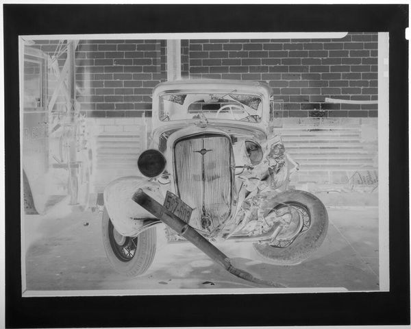 Curator: Here, we have an intriguing untitled photograph, "old wrecked car," by Lucian and Mary Brown. Editor: Well, my first thought is that it's an elegy—for industry, for a certain kind of masculine freedom promised by the open road. The inverted tones amplify that feeling of loss. Curator: The photographic negative almost feels like an x-ray, exposing the vulnerability beneath the car's form, a poignant reminder of mortality. Consider the cultural symbolism of the automobile. Editor: Exactly, cars became symbols of progress and personal liberty, especially for the working class. This wreck speaks to broken promises, planned obsolescence, and ultimately, a critique of consumer culture. Curator: Yes, and I see the enduring human fascination with ruins—structures that echo past ambitions and fallen empires. There's an inherent beauty even in decay. Editor: Ultimately, it is a stark reflection on the costs associated with our relentless pursuit of progress and its impact on the environment. Curator: It certainly compels us to contemplate the narratives embedded in the objects we often overlook. Editor: Yes, revealing how artifacts of everyday life encode complex histories.