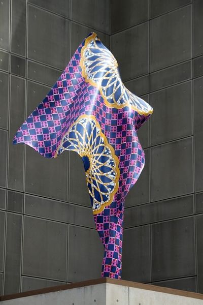 Yinka Shonibare created this Wind Sculpture using painted fiberglass. The sculpture, frozen in an unseen gust, brings a joyful sense of improvisation and play. Shonibare is known for using vividly patterned Dutch wax fabric, a globally traded material originally inspired by Indonesian batik. These textiles are made in the Netherlands and West Africa, and have become closely associated with African identity, speaking to global trade routes and hybridity of cultures. Wind Sculpture, in its fabrication, relies on industrial processes of molding and painting. Fiberglass lends itself to complex curvilinear shapes and bright colors. It also allows the work to withstand the elements. The process of making the artwork is particularly meaningful. Shonibare employs skilled artisans to execute his vision. His engagement with global issues, post-colonialism and cultural identity, encourages us to consider art beyond its aesthetic qualities. The materials, making, and context, reveal the artwork’s full meaning, challenging traditional distinctions between fine art and craft.
