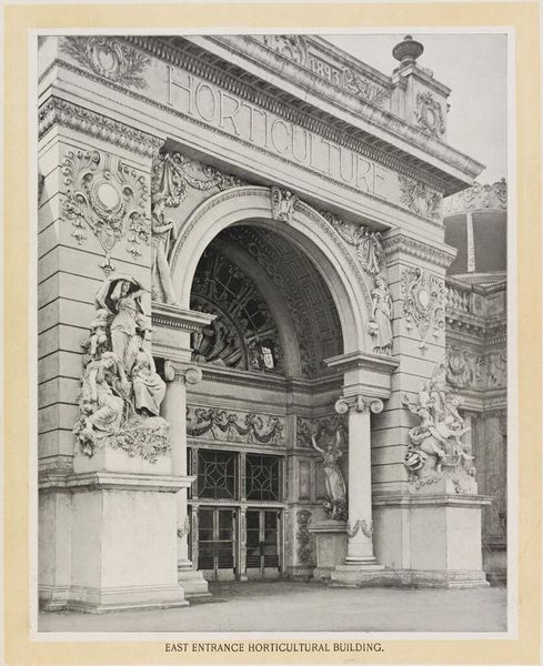 Curator: Right, let’s dive into this photograph. This albumen print, titled "Poort van het Louvre aan het Place du Carrousel te Parijs," captures a view of the Louvre entrance, taken sometime between 1865 and 1880 by Achille Quinet. Editor: The overwhelming effect of it is a serene stoicism—despite the street clutter in the foreground. Those allegorical statues really anchor the whole thing. They kind of hum with silent grandeur. Curator: Absolutely. We see a strong employment of Neoclassical elements, especially in the architecture. The meticulous detail rendered through the photographic process enhances the structure's monumentality. Note the play of light and shadow, creating a textured surface on the stone. Editor: What strikes me is how Quinet framed this very ordered scene in the context of day-to-day life, evident in the somewhat haphazard elements around the entrance itself. Like an intentional counterpoint or a kind of subtle rebellion. There’s even something incredibly chic about the gas lamps. Curator: I'm not sure if I see rebellion, perhaps more of a study in contrasts: The grandiosity of the Louvre set against the ordinary hustle. Consider the semiotics of the frame: The arches almost serve as theatrical curtains, inviting us to analyze the narrative frozen within. Editor: I dig that reading! It does pose the question: What are we invited into, really? Past that impressive façade? It's also remarkable how well the albumen print translates texture—you can almost feel the Parisian dust! Curator: And the texture enhances the discourse! Consider the horizontal banding created by the levels of the structure, weighed against the vertical thrust of the arches and the statues. These juxtapositions encourage the eye to keep moving. Editor: Yes! Like a carefully orchestrated symphony in sepia tones. Makes you want to hop in a time machine and stroll right in there! Curator: I find the dialogue it stages between permanence and ephemerality quite compelling, offering us a sustained reflection on temporality itself. Editor: Well put! This photograph's quiet grandeur certainly leaves a lingering, evocative resonance long after the first glance.
