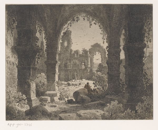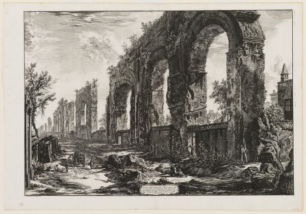 Giovanni Battista Piranesi created this artwork titled, 'Interior of the Temple of the God Canopus in the Villa Adriana at Tivoli', using etching techniques. The print plunges us into a world of dramatic contrasts, where light and shadow collide within the ruins of an ancient temple. Piranesi masterfully uses hatching and cross-hatching to evoke a sense of decay and grandeur. The weight of history is palpable in every line, inviting the viewer to contemplate the passage of time and the ephemeral nature of human achievement. The composition emphasizes the verticality of the temple's arches and columns, drawing our gaze upward towards the open sky. This interplay between the man-made and the natural world speaks to the Romantic fascination with ruins as symbols of both loss and sublime beauty. The human figures scattered throughout the scene serve to underscore the scale and monumentality of the architecture, while also suggesting a narrative of exploration and discovery. Ultimately, Piranesi's etching functions as a meditation on the relationship between the past and the present, inviting viewers to engage with history as a living, breathing entity.