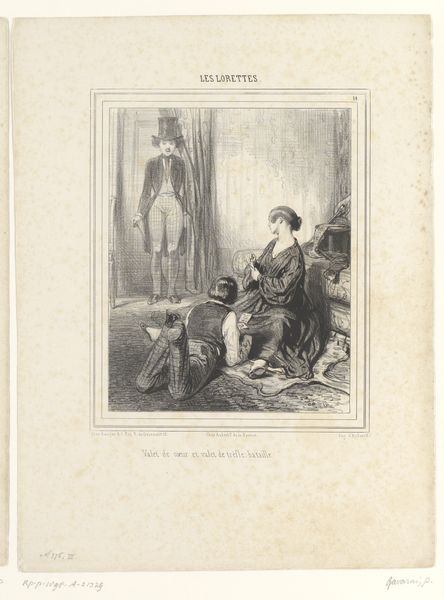 Curator: The mood is quite somber, isn't it? A rather quiet drama seems to unfold on the paper. Editor: Indeed. We're looking at "Achtste beproeving," which translates to "Eighth Tribulation," a graphite drawing from 1828 by J. Richez. The drawing showcases a narrative scene. I notice its graphic impact, created by dark, bold lines contrasting with the light and subtle crosshatching and smudging of the background tones. Curator: Note the social commentary embedded here. The soldier’s grand uniform, rendered meticulously, immediately signifies status. Yet his rather cartoonish posture juxtaposed with the painter, seated humbly before his easel, evokes a tension between power and creation, between the martial and the artistic. What kind of exchange will occur between the characters? How can we use semiotics to better appreciate this cultural encounter? Editor: Absolutely, the contrast between the two figures is central. And note the very balanced pyramidal composition in play, from the painter’s head up to the bust on the back shelf and down the long, lean line of the approaching uniformed gentleman! Curator: Also notice those busts. They are classical antecedents from antiquity—ancient icons placed reverently on the upper left, signifying history. How does Richez speak to the symbolic language of heroism and remembrance here, I wonder? Editor: Interesting question, I suppose those references point toward artistic authority. If the drawing style were a bit different, the narrative moment would be reminiscent of a Dutch Golden Age painting by someone like Jan Steen. Richez achieves something unique, though, through his own stylistic touches. Curator: In a way, this piece touches on timeless human struggles of ambition and recognition— the artist's dedication against the allure of fleeting worldly glory perhaps? The work speaks volumes, even without vivid color or grandiose scale. It's like a perfectly captured still from a longer, perhaps satirical, visual story. Editor: Precisely. It demonstrates that through close observation of formal qualities, and attentiveness to how the visual composition interacts, we can find meaningful context to reveal narrative power.
