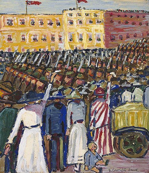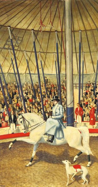 Curator: Here we have Martiros Sarian's 1933 oil painting, "Mountainous March of Armenian Units." It's quite a powerful piece of Soviet-era art. Editor: Powerful indeed. My immediate impression is one of relentless movement. A wave of soldiers ascending into some kind of... incandescent landscape? It feels both energetic and unsettling. Curator: Yes, that blend is key. Sarian was a master of color, and here he uses those vibrant oranges and yellows not just to depict the landscape but to evoke a sense of revolutionary fervor. The mountains are not just geographical features; they are symbols of the challenges faced by the units, a hurdle of progression. Editor: The figures, while numerous, are almost standardized, aren't they? Yet, their expressions, or lack thereof, contribute to a feeling of unwavering resolve. The red stars are practically shouting their ideology to anyone viewing. Curator: Precisely. Sarian’s focus on collective imagery serves the Socialist Realist agenda prevalent at the time, idealizing a unified force marching toward progress. However, the use of such an expressive style lends itself to be classified as Soviet Non-conformist art. Editor: And look at how the column of soldiers appears to morph almost organically out of the mountain. The mountain range in Armenian culture also symbolize hope, eternity, strength, which are some images Sarian is trying to show to the population with this painting. It feels as if they’re inseparable. But that color palette feels a little unreal, somehow... more symbolic than literal. Curator: Sarian often used color symbolically, drawing from traditional Armenian art and his deep connection to the land. The colors can speak to a vision of a new, almost utopian future. While commissioned during Soviet rule, it holds universal appeals to the symbol of a rising population through symbolism that’s been apparent since Armenia's rich ancient past. Editor: Interesting how even in its portrayal of collective strength and its revolutionary themes, one can still trace older symbols about persistence. Thank you, this was especially enlightening to view with context in mind. Curator: My pleasure! Seeing artwork like this helps illuminate that even during periods of strong socio-political shaping, there is so much you can derive by understanding history through the artist's individual visual language.
