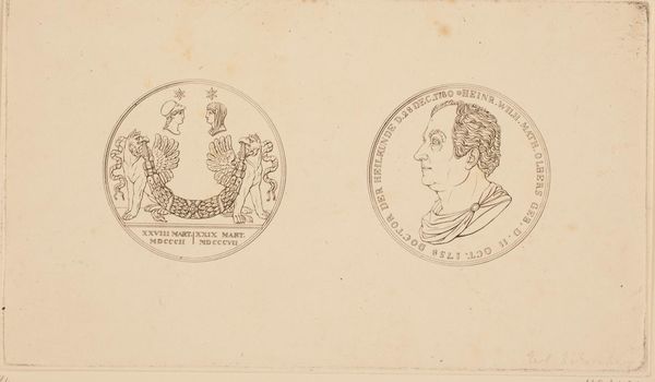 Curator: Before us we have "Voor- en achterzijde van een penning met portretten van Hendrik III en Catharina de' Medici," a drawing in ink by Bernard Picart dating from 1683 to 1733, now housed in the Rijksmuseum. Editor: It's fascinating how even in simple ink drawings, portraiture can evoke such a sense of historical gravity. There's a formality here, but something about the direct gazes hints at personality. Curator: Absolutely. These portraits, presented as the front and back of a medal or coin, immediately situate us in the turbulent power dynamics of 16th-century France. Henry III's reign was marked by religious wars and intense political maneuvering. Considering that his mother, Catherine de Medici, practically ruled France for a significant period, her looming presence in this depiction tells us a great deal about gender, power, and influence at court. Editor: I agree. The iconography of the time would imbue these images with complex meaning for those who understood the symbols. Circular portraits often echo coins or medals, symbolizing status, lineage, and historical weight, but the style reminds me of Roman Cameos, the brown ink creating something that could easily resemble ancient artifacts and cultural icons. The visual echoes of wealth and power create continuity with their roles as Royalty. Curator: And we cannot disregard the intersectional aspects: the representation of a king vis-à-vis the significant impact of his mother. Even today, this presents interesting challenges about how power is assumed and transmitted. Was he the sole ruler, or merely an instrument guided by her politics? Editor: The faces have distinct visual features in the work. The meticulous detailing applied to Henry III's ruffled collar and hairstyle immediately catch my eye. Picart carefully renders a tangible essence of masculine regalness. In contrast, Catherine de Medici possesses a serene, almost pious countenance. Her modest head covering conveys not only status but an implied dedication to dynastic responsibility. Curator: A reading emphasizing those oppositions, feminine influence vs. masculine authority, would reinforce common stereotypes. However, consider if both strategically project specific images to exert dominance differently. Understanding her impact challenges the narrative. Editor: Fascinating point. This artistic representation offers, more than mere visual history, complex social narrative through the lenses of representation, cultural continuity, and authority. Curator: Yes, thinking of this artwork allows one to navigate discussions around power and cultural influence within evolving theoretical perspectives. It’s powerful indeed.