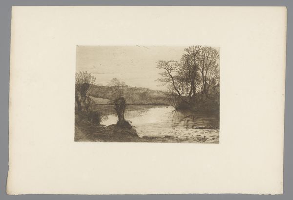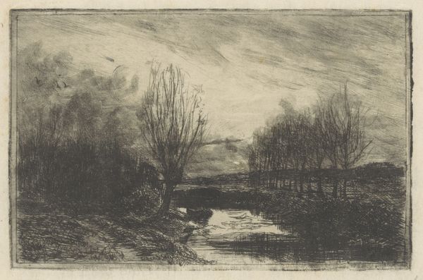 This etching, Sloot met knotwilgen, by Barbara Elisabeth van Houten, feels immediate, like a fleeting impression captured in ink. The scene is defined by a network of fine lines, a process of building up tone and texture through careful marks. It's as though she's thinking through the image with each stroke. There’s a real sense of atmosphere here, a moody landscape evoked through the density of the lines. The reflections in the water are particularly evocative; see how they dissolve the forms, blurring the line between solid and liquid. It’s these passages that capture the transient nature of the scene. The bare trees, rendered with a flurry of thin marks, give a stark, almost desolate feel. The way Van Houten uses line reminds me of Whistler, particularly his etchings of the Thames. Both artists share a sensitivity to light and a willingness to embrace the accidental, making art from the everyday.