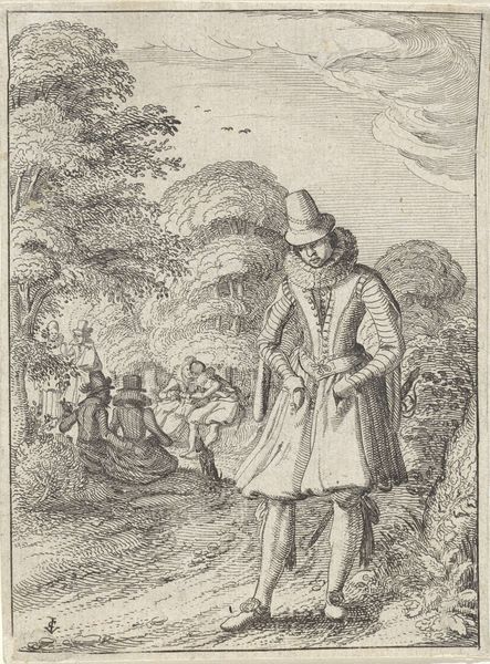 Pieter Nolpe created this print, "Konstance in gesprek met Don Jan," sometime around 1643. The composition divides the scene into distinct zones through the use of line and form. In the foreground, Nolpe presents us with three figures—Konstance, a bearded man, and Don Jan. Nolpe uses a clear, descriptive linework that separates them from the background, marked by softer lines to depict an outdoor scene. The artist uses linear perspective to draw the eye toward a gathering of smaller figures around a fire. This contrast in scale and detail guides our focus, emphasizing the relationship between the foreground figures and the distant group. The arrangement invites us to consider the power dynamics and the modes of representation at play. Nolpe's use of line and form creates a structured visual field that not only tells a story but also invites a deeper reflection on how meaning is constructed through visual means.