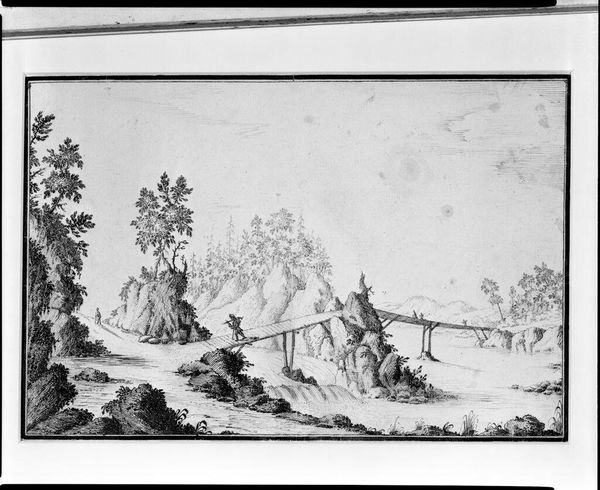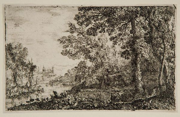 Curator: This is Crescenzio Onofri's "Landscape," an etching measuring about 26 by 38 centimeters. The image presents a dark, almost brooding, foreground of trees set against a distant landscape. Editor: It feels so textured, doesn't it? I'm drawn to the way the ink creates depth, especially in the density of the foliage. You can almost feel the different weights of the etched lines. Curator: Onofri was working within a specific tradition of landscape—one that idealizes nature but also acknowledges its power. The print medium allowed for wider dissemination of such views, shaping perceptions of nature and the pastoral. Editor: And consider the labor involved—the repetitive action of etching, the careful layering of lines to build up tone. It highlights the relationship between artistic skill and the physical act of making. Curator: Absolutely. Onofri's landscapes also speak to the growing interest in nature that reflects a very specific social and political power dynamic, where access to land and its resources were increasingly concentrated. Editor: Looking closely at the materiality really lets me consider the process of how the image was crafted, and how the artist's labor becomes intrinsically linked to the artwork itself. Curator: Examining Onofri's work with a lens of social power helps us better understand the cultural values assigned to land and ownership at the time. Editor: I agree, and seeing the landscape through the lens of labor and production makes me appreciate the artist’s skill in a whole new way.