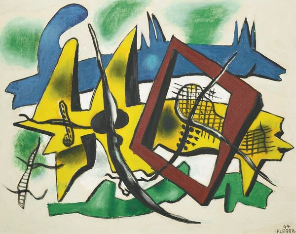 Editor: So, this is Fernand Léger’s "Green Leaf," painted in 1945. It's an oil painting. When I first saw this, the way Léger uses all these geometric shapes kind of reminded me of architectural models… a little chaotic, maybe? What jumps out at you? Curator: Chaos, you say? Hmm, perhaps it's controlled chaos! I see Léger’s playful defiance of perspective, and that heavy outline—the *line* itself is the star, isn't it? A sort of flattening that gives equal importance to all elements. It’s almost like a dance of industrial and organic forms…a yearning for harmony post-war. It's quite optimistic, in a strangely grounded way. Do you feel that tension too? Editor: I can see that… the optimism, definitely, especially with those bright colours. So the forms feel both industrial, sharp edges but also that soft, kind of cartoony colour scheme… Was he intentionally combining those? Curator: Absolutely! Léger was obsessed with the beauty of machines *and* the resilience of nature. Think of him as this joyful mechanic who stumbled upon a garden and decided to build a flower out of spare parts. These hard, geometrical shapes mixing with softer organic forms are like visual poetry... like two distinct cultures starting a conversation. Editor: Visual poetry – I love that! Now I am not sure if it's chaotic. It almost has a feeling of hope and resilience after such a dark period in time. Curator: Precisely! Perhaps the painting's own quiet revolution. Editor: Thanks for that fresh perspective! I definitely have a better understanding of it. Curator: And thank *you* for bringing your insightful impressions! Art truly blooms when we share our visions.