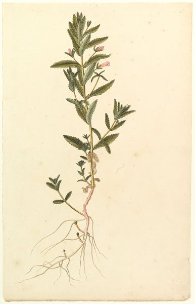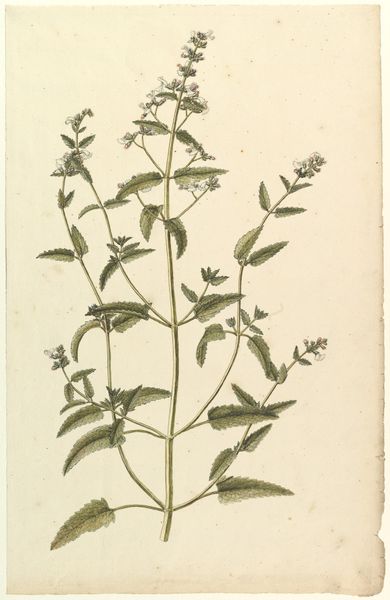 Editor: This is a botanical illustration from sometime between 1649 and 1659 by Hans Simon Holtzbecker, housed at the SMK in Copenhagen. It's watercolor, gouache, and drawing on paper, depicting three varieties of mint. I’m immediately struck by how delicate the artist's hand was to render all these leafy plants. What specifically draws your attention about this piece? Curator: Formally, the arrangement immediately establishes a strong vertical rhythm. Note the repetition of the leaves and flowers along each stem, guiding the eye upwards. Holtzbecker's masterful use of watercolor is also apparent. Observe the translucency and layering of the greens that gives them such lifelike form. Do you perceive any deliberate variations in line weight? Editor: Yes, definitely. The roots seem more detailed with thinner lines. The flowers look to have fainter outlines to emphasize their delicate blooms. Does this contrast in linework have any impact on how you view the overall composition? Curator: Indeed. This variation reinforces the importance of each botanical element and also the hierarchy of its details. Notice how, in paying attention to these minute differences, the essence of the natural specimens emerges. We are not just seeing ‘mint,’ but an analytical portrait of botanical structures that is very methodically and meticulously planned in the structure of the illustration. Do you agree that this focus elevates what could easily just be 'pretty,' into the sphere of studied artistic observation? Editor: Absolutely. Focusing on how the artist’s methods shape how we perceive it turns these lovely drawings into serious artworks! I didn't expect so much intentional design to come through so clearly. Curator: Precisely. Analyzing its structure allows for such discoveries.