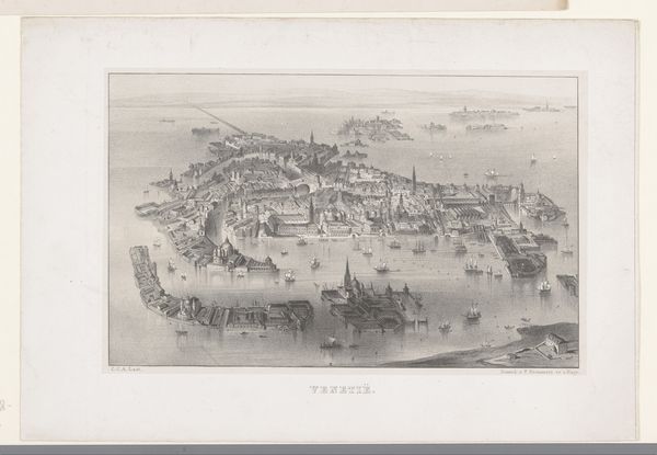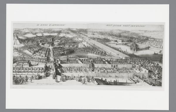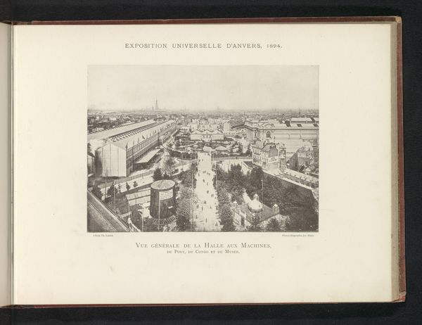 Editor: Here we have the "Wereldtentoonstelling van 1883 te Amsterdam," or "The World Exhibition of 1883 in Amsterdam," a print by E. & A. Tilly. Looking at it, I'm immediately struck by the incredible detail in this cityscape. All those tiny people and structures. What stands out to you from a formal perspective? Curator: The rigorous perspectival construction and the subtle gradations of tone immediately grab my attention. Observe how the artists delineate depth, guiding the eye from the elaborate foreground architecture toward the horizon, primarily utilizing linear perspective and tonal variations within a monochromatic scheme. Consider, too, how the repeated rectangular forms of the exhibition halls contribute to an almost architectural rhythm, don’t you think? Editor: Yes, the repetition is very clear, it feels very industrial in a way! Does the fact that this is a print, rather than a painting, change how we should view it? Curator: Decidedly. The inherent reproducibility of printmaking invites reflection on notions of authenticity and originality. How does mechanical reproduction alter our relationship to the represented subject? Is it diminishing its essence or democratizing access to its image? The print acts as an index, marking a specific historical event, yet also becoming a signifier of broader cultural values. Editor: That’s a perspective I hadn’t considered. So, instead of seeing just a scene, we see ideas about reproducibility and accessibility. Curator: Precisely. Consider also how the precise linework creates texture within the cityscape. We may discern shifts in visual rhetoric, suggesting modernity even within its seemingly representational style. By analyzing the composition and its method, we extract layers of cultural significance, inviting a deeper appreciation of form and function. Editor: I'm beginning to see how the medium itself plays such a significant role. Thanks, that really opens it up for me! Curator: My pleasure, I believe we've extracted considerable insights from it today.