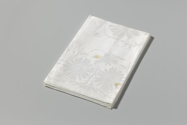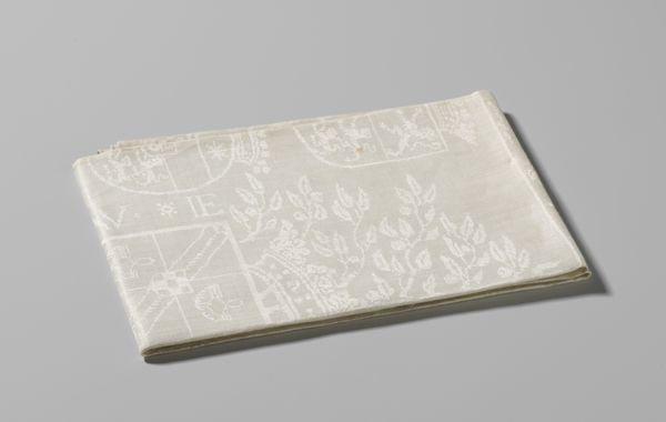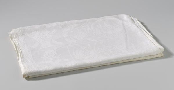 Curator: Here we have “Tafellaken,” a decorative textile produced sometime between 1850 and 1900 by the firm De Leeuw. Editor: It's deceptively simple at first glance, isn't it? Just an off-white cloth folded on a neutral surface. But the subtle floral damask elevates it. It gives off an air of restrained elegance and almost…ghostly domesticity. Curator: I agree. Objects such as this give insight into the rise of industry and manufacturing culture, showcasing textiles produced for bourgeois households. A table linen signifies order, cleanliness, and a specific form of social display, right? Editor: Precisely! A seemingly innocent piece like this table linen reveals much about class and social standing, think of its use as a stage for the performance of family life, gender roles and national identity. The very act of setting a table is a deeply symbolic act that has historically been regulated by custom, manuals and etiquette. Curator: You make an important point about performativity. And thinking about the materiality, the specific floral damask could point us toward aesthetic trends of the period. Editor: Definitely. Motifs can echo sociopolitical statements through pattern and surface design. These florals may reference then-popular symbols of prosperity or imperial power; it would be revealing to delve deeper into the meanings encoded within those specific flower types. Curator: This points toward a conversation around colonial expansion too. How objects like these were traded across regions, potentially at the expense of labor and resources in colonized lands. Editor: Indeed. It makes you ponder the ethics of displaying domestic items from that era outside that very context, the ghosts present or absent. A plain piece of cloth quickly morphs into a loaded object when you tease out such narratives! Curator: Thank you! By understanding these dynamics, we can re-evaluate and expand our appreciation for not just aesthetics but also cultural significance. Editor: Exactly. This piece, so simple on the surface, encourages us to unravel historical threads of empire, class, and design sensibilities.