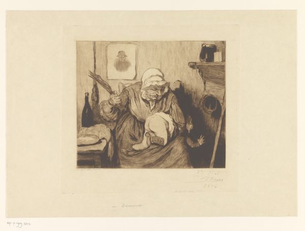 Piet Verhaert created this etching, "Man weegt kostbaarheden bij lamplicht," using delicate lines to construct a scene bathed in a subtle, ambient light. The composition is anchored by a central figure meticulously weighing valuables, an action that draws us into a world of quiet concentration. The artist's skillful use of light and shadow not only defines the forms within the image but also contributes to the narrative's emotional depth. Notice how the detailed textures of the objects and the figure's garments contrast with the smooth, reflective surfaces, enhancing the tactile quality of the scene. This etching invites us to reflect on the artist's formal choices and how these elements might symbolize broader themes of value, perception, and the human condition. It does not present fixed, singular interpretations but encourages a dynamic, ongoing engagement with its visual and cultural subtexts.