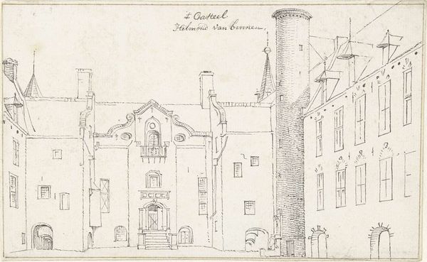 Curator: Here we have Cornelis Pronk’s “Kasteel Frisselstein bij Veghel,” a drawing made with ink on paper, sometime between 1720 and 1740. It currently resides here at the Rijksmuseum. Editor: It’s remarkably spare. A skeletal castle emerges, precise yet strangely incomplete. There's a ghostly quality. Does the iconography of bare lines suggest a building on the verge of disappearance, or perhaps an unrealized architectural dream? Curator: Well, Pronk was commissioned to meticulously record existing structures and potential improvements across the Dutch Republic. His drawings were highly valued as tools for understanding the spatial and economic landscape. So in that context, it functions more like a survey. Editor: I see, so more of a matter-of-fact accounting. Even so, consider that sturdy, almost defiant round tower, offset by what looks to be an unusually ornate cross visible through the gateway. There is a latent suggestion of resilience, of history battling modernization. The bare, skeletal representation could echo a period undergoing radical transformation, of societal structures evolving to something more sparse, more calculated, much like this very image. Curator: I appreciate your perspective. These landscape drawings circulated widely among officials, architects and wealthy landowners invested in projects to expand networks for transport and resource management. So yes, one can imagine a great shift occurring at that time. Pronk's rendering might, in effect, mark that turning point. Editor: There’s a psychological component at play here as well. Note the almost hesitant rendering of the foliage—an ethereal border. Are the blurred natural forms hinting at an underlying anxiety as urban areas were growing at unprecedented speed? The drawing then functions not only as document but also barometer of cultural attitudes. Curator: That’s a useful addition. In this context, consider Pronk's patronage – powerful municipal bodies leveraging art for purposes far removed from personal expression or aesthetic exploration. Understanding that transactional framework, where images acted as reports influencing future landscapes, provides deeper insights into these baroque realist pieces. Editor: Indeed, understanding this historical usage re-contextualizes its impact on us. What was once a blueprint is now a fascinating mirror. Curator: A truly productive line of thought.