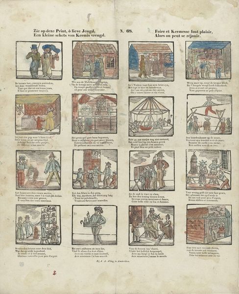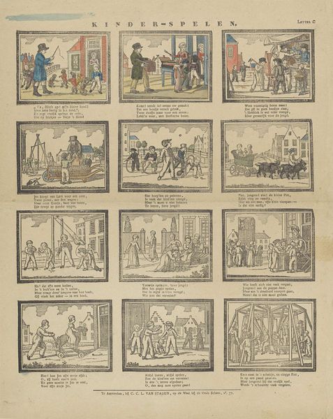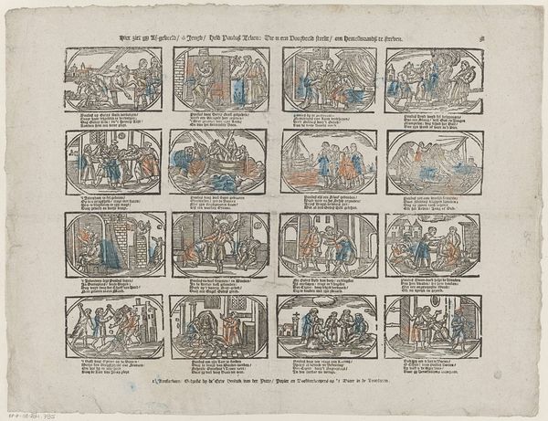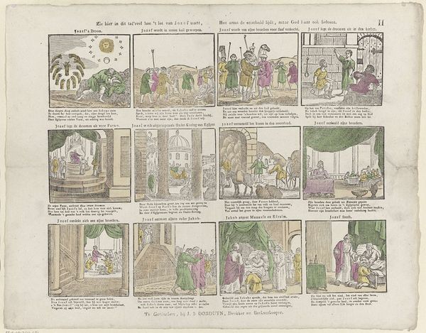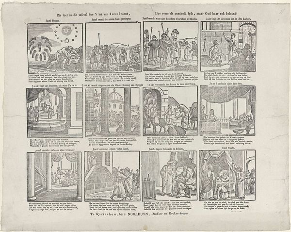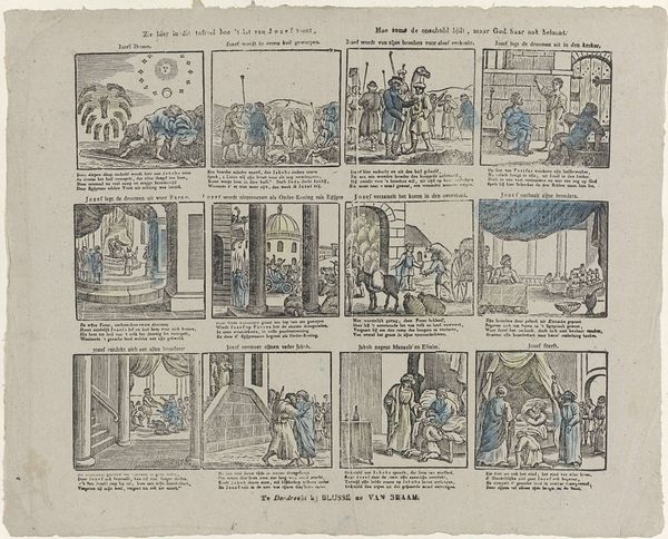 Alexander Cranendoncq created this print, “Zie hier in dit tafreel hoe 't lot van Jozef toont,” which translates to “See here in this scene how the fate of Joseph unfolds,” sometime between 1799 and 1869. The series of images depicts the story of Joseph from the Book of Genesis. These biblical narratives were often used to reinforce societal norms and power structures. In this context, Joseph's story, marked by suffering and eventual triumph, underscores themes of perseverance and divine justice. It’s important to consider how such narratives might have been used to both inspire and control populations, particularly those facing hardship. How does the concept of ‘innocence’ being rewarded by a higher power resonate differently depending on one's social position or access to justice? The print’s emotional core lies in its depiction of human resilience. It asks us to consider the intersections of faith, identity, and social mobility, reflecting the complex ways in which individuals navigate their place within society.