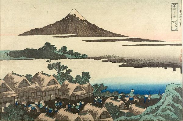 Curator: This is Katsushika Hokusai's "The Cushion Pine at Aoyama," a woodblock print from his celebrated "Thirty-Six Views of Mount Fuji" series. Editor: Immediately, I'm struck by the sheer scale—that pine just dwarfs everything, even Fuji lurking in the background! It feels almost dreamlike. Curator: That dominance speaks to Hokusai’s clever manipulation of perspective, reflecting Edo period society and its relationship with nature. Fuji, while culturally central, takes a backseat to the everyday life unfolding around the pine. Editor: I love how the figures nestled under the tree seem to be engaged in simple, timeless rituals. It's as if they are deliberately turning away from progress, maybe seeking solace in the shadow of something ancient. Curator: Indeed. Hokusai lived through a time of great social upheaval and political change. "Thirty-Six Views" provided him with a platform to explore the role of landscape in identity and cultural memory. Editor: Knowing that Hokusai explored the ordinary to emphasize the importance of the period gives even more depth to this scene. It makes me think about my own connection to home. Curator: It’s a wonderful point. I agree; Hokusai captures the ephemeral beauty of both nature and humanity with such care and intent.