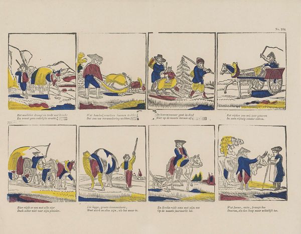 Editor: Here we have a print titled "Elk mensch hij zij dan klein of groot / Moet zorgen voor zijn daag'lijks brood" from sometime between 1848 and 1881, attributed to Lutkie & Cranenburg and hanging in the Rijksmuseum. It gives me this quaint storybook vibe. All these little vignettes depicting everyday life…what do you make of this folksy piece? Curator: It whispers of a world clinging to simplicity, doesn’t it? The colours, like shy smiles, peek through the monochrome like memories struggling to surface. I wonder what “daag’lijks brood” truly meant for those glancing at this print then. A reassurance? A gentle prod? Each frame feels like a chapter in a silent novel. Does it read to you as celebration, or something more subdued? Editor: I think a little of both. There's toil in several panels, a definite “get your hands dirty” message, but also…are those market scenes, hinting at reward for the effort? Curator: Perhaps. I am charmed by how compact each narrative is – miniature universes thriving in isolation. Lutkie & Cranenburg manage to turn economic necessity into intimate theatre. Doesn't it also provoke a curious sense of communal experience? The sharing of struggles and successes? Editor: Absolutely. It’s a tiny mirror reflecting society itself, showing people connected by daily efforts. Looking at the image now, it feels like the ‘folk art’ label undersells it - the art certainly has power. Curator: Precisely! We begin by considering a message about work ethic, yet the print evolves before us; the panels join into one communal identity. What an astonishing achievement! Thank you for pointing the art.