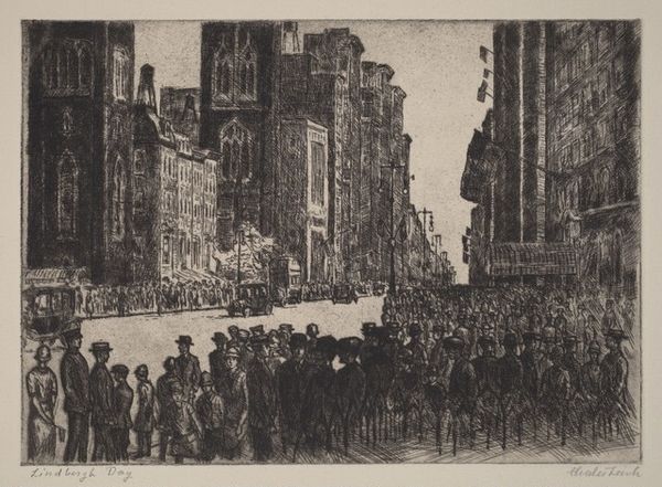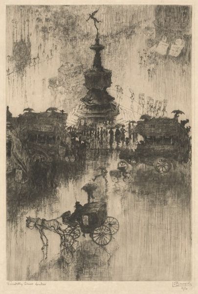 Curator: What grabs me right away is the sort of shimmering, dreamlike quality. Editor: It’s true, there’s a real effervescence to Joseph Pennell's "The Fountains Playing at La Granja," made around 1903. It's chalk and charcoal on paper, currently residing here at the Art Institute of Chicago. Curator: Those stark blacks and whites really make the water look alive, like spirits dancing in the air. The composition is quite striking, too; almost theatrical. The crowds seem dwarfed by the sheer force of the waterworks. It’s more than just a fountain; it’s an event. Editor: Absolutely, and think about the labor involved in creating such elaborate displays – the engineering of the fountains, the maintenance, the water supply. It highlights a specific kind of leisure afforded to certain social classes at the time, doesn't it? What resources are consumed to make that ephemeral joy manifest? Curator: A pointed question! Maybe it speaks to the yearning we all have to witness something extraordinary, something fleeting and unrepeatable. Like life itself, you know? And that delicate paper base; it’s ironic that something so seemingly fragile becomes the stage for such monumental imagery. Editor: That fragility makes me think of the coal and chalk dust itself. They're remnants of geological time and intense human effort now used to represent another fleeting scene. Also, notice how Pennell leaves much of the page untouched, raw. This contrast with the detailed areas around the fountain makes me think about the economics of image-making and the artist's deliberate choices around value and extraction. Curator: A potent observation! This piece, to me, embodies the magic found within contrasts. It leaves one yearning for spectacle, for shared human experience, and maybe even for the beautiful ephemerality that’s just beyond reach. Editor: Precisely. Pennell's work asks us to contemplate not just what we see, but the societal scaffolding upon which these magnificent yet fleeting displays were, and still are, constructed.