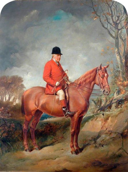 Editor: Here we have Franz Xaver Winterhalter's "Equestrian Portrait of François Adolphe Akermann," created around 1870 using oil paint. I find the subdued palette quite striking; it evokes a sense of calm and perhaps even understated authority. What stands out to you compositionally? Curator: Immediately, the tonal gradation establishes a clear hierarchy. Note how Winterhalter uses a restricted range of earth tones, punctuated by the glints of light on the horse's coat and Akermann’s slightly illuminated face. This directs our gaze through calculated focal points within the composition. Observe the diagonal created by the horse's body, its line reinforced by Akermann’s posture, bisecting the canvas and generating a dynamic tension against the static background. What purpose does this tension achieve, do you think? Editor: Perhaps to bring the viewer's eye towards the portrait? What can you tell me about that background? Curator: Precisely. The background, loosely defined, serves merely as a foil. Its lack of detail and hazy atmospheric perspective ensures that Akermann and his horse remain the primary subjects, devoid of distractions. However, it is crucial in establishing depth. Consider how the values shift as we move further back in space, creating an illusion of recession and thus anchoring the equestrian figure firmly within a three-dimensional plane. The background lacks clarity and clear color distinction which ultimately leads to greater emphasis of the subjects of the portrait. Editor: That’s fascinating. I had initially seen it as merely background scenery, but I understand the importance to create a coherent overall design. I now notice how it functions in relation to the foreground elements. Thanks! Curator: Indeed. Focusing on formal elements unveils the considered compositional choices underpinning even seemingly straightforward portraiture.