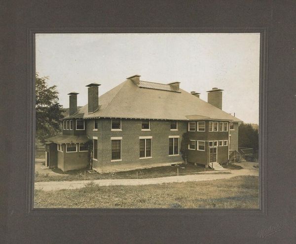 Curator: This albumen silver print by Woodhead Studio, taken in 1906, depicts the nurses’ home at the Massachusetts State Hospital for Epileptics. Its title is... well, quite telling, isn't it? Editor: The composition is stark; the building's rigid geometry against the barren landscape evokes a sense of isolation and control. The tones are muted. Curator: Indeed. Let's consider the context. This was a time of intense social engineering and institutionalization. The photograph serves as documentation, part of a larger narrative of how society dealt with those deemed "defective." Think of the labor involved in building and maintaining such facilities. Editor: The visual emphasis on the architectural structure, with its symmetrical facade and regimented windows, suggests an attempt to impose order and rationality on the perceived disorder of epilepsy. There is a visual language of control being communicated here. Curator: Precisely, and the materials—brick, wood—speak to a certain permanence and solidity, reinforcing the institution's role. The nurses, the labor force, are unseen, yet central to the functioning of this place. Editor: Ultimately, the photograph's formal qualities amplify the unsettling nature of its subject. It is a chilling artifact. Curator: Absolutely, the image offers a glimpse into the complex intersection of social attitudes, labor practices, and the lives of those within and outside of its walls.