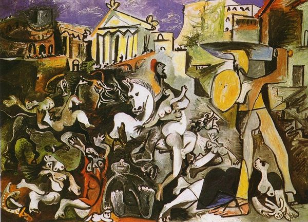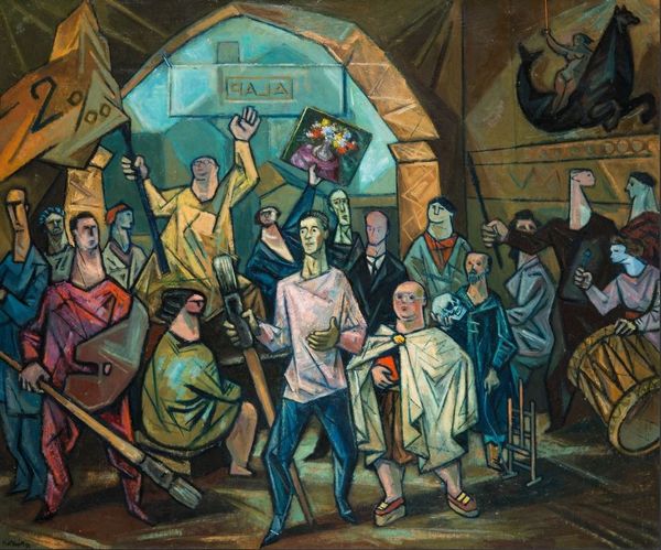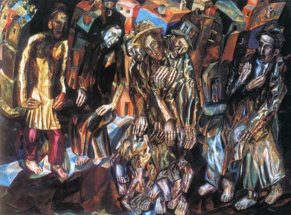 Curator: Pavel Filonov created "At the Table" in 1913. The artist employs oil on canvas, rendering an uncanny gathering with bold color and distorted figuration. What’s your initial take? Editor: It's unsettling. The faces are mask-like, with these vacant, downward gazes. There's a density and claustrophobia about the composition. The colors are lively, yet there is an underlying mood of weariness. Curator: Absolutely. Filonov, deeply embedded in the Russian avant-garde, especially its expressionist and cubist influences, used art as a platform to critique societal structures. Considering the backdrop of pre-revolutionary Russia, what narratives might this work embody? Editor: Knowing that, it immediately strikes me as a representation of societal fatigue, the oppressive weight of the Tsarist regime, and the social inequities it spawned. The figures, confined around the table, seem burdened, almost trapped. Are we meant to infer some hidden commentary on power and its discontents? Curator: Precisely. Filonov opposed conventional artistic norms, choosing instead to champion the notion of "organic growth" in art, implying an artwork should develop similarly to organic entities, expanding from the inside outward. Editor: Which manifests in the way that everything seems to be fragmented and rebuilt. Is that also reflective of societal fragmentation or the fracturing of traditional values? I also want to call attention to the eyes. Their positioning in contrast to the positioning of their heads. There's such hopelessness portrayed here. Curator: Exactly. The intentional distortions and disjunctions reflect Filonov's belief in the 'biologicalness' of painting, infusing social critique with his unique artistic process. One that disrupts bourgeois complacency. The formal qualities mirror political unrest, offering commentary that is deeply insightful when considering Russia's looming revolution. Editor: That certainly gives greater depth to these unnerving characters at the table. It is now hard to see the image as only portraying sadness or unhappiness, rather one of the consequences of oppression. Thank you for adding so much context. Curator: You’re welcome. Understanding the artist's intention enriches the meaning we make. The fusion of art, societal consciousness, and theory really empowers this painting's continued relevance for dialogue today.
