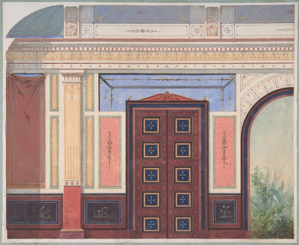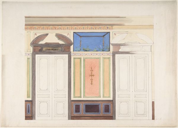 Jules-Edmond-Charles Lachaise created this design for painted wall paneling at Deepdene, in Dorking, Surrey, using watercolor, graphite, and pen and ink. The Deepdene estate, owned by the Hope family, was known for its extensive art collection and lavish interiors, embodying the wealth and status of the British aristocracy. Lachaise's design reflects this social milieu, showcasing an idealized vision of domesticity and taste. The paneling, with its muted colors and classical motifs, evokes a sense of refined elegance and order. Yet, the careful arrangement and subtle ornamentation also speak to the ways in which identity and social roles were constructed through interior design. Consider how the layout of a room can dictate interactions, shaping gendered and classed expectations within the domestic sphere. The aesthetic choices, while seemingly innocuous, reinforce specific social hierarchies and cultural values, inviting us to reflect on the power dynamics inherent in the spaces we inhabit.