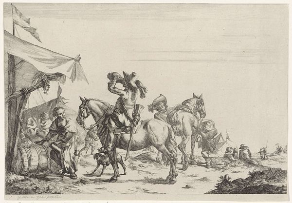 This print, Resting Hunting Party, was made by an anonymous artist using etching. It presents us with an intriguing glimpse into social life, likely somewhere in 17th or 18th century Europe. The image is a snapshot of leisure, portraying a well-to-do group pausing during a hunt. Note the figures on horseback, the fashionable hats, and the dogs—all visual codes indicating wealth and status. What I find compelling is the potential commentary on social hierarchies. Is the artist celebrating the aristocracy's pastimes, or subtly critiquing their detachment from the lives of the common folk? To fully understand this work, we'd need to delve into the period's social history. Researching hunting practices, fashion trends, and class relations would give us a richer context. Art history, after all, isn't just about aesthetics, it's about understanding the conversations art has with its own time.