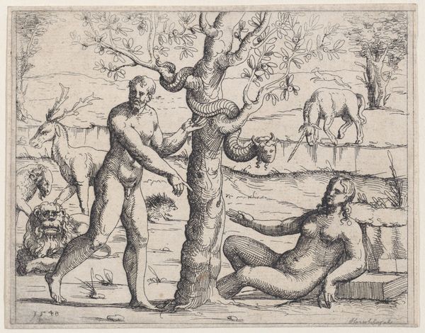Editor: Here we have Augustin Hirschvogel’s "Adam and Eve Eating the Forbidden Fruit" from 1548, currently housed in the Metropolitan Museum of Art. It’s an etching, surprisingly small. The scene feels strangely peaceful, despite the gravity of the subject. What strikes you when you look at it? Curator: I notice the complex interplay of religious narrative and the burgeoning interest in landscape. This was created during the Reformation, a time of great upheaval and re-evaluation of religious authority. The print medium itself democratized images, spreading ideas beyond the Church's control. Editor: Democratization through prints…that’s fascinating. But how does the landscape fit in? Curator: The landscape setting is not merely a backdrop. In Northern Renaissance art, landscapes often symbolized moral and spiritual states. Look at the relatively untamed wilderness surrounding Adam and Eve. Does that speak to you at all about humanity’s place within that time? Editor: It's wild but…domesticated at the same time? Like, there are deer, but also bunnies hopping around. It feels controlled, not truly Eden-like. Is Hirschvogel suggesting something about the artificiality of even the ‘natural’ world? Curator: Precisely. The ordered nature suggests a specific vision – one influenced by humanist thought that was emerging at the time. Also consider who commissioned such images and for what purposes they would be used. These kinds of images are complex visual arguments. Editor: So, this small print, seemingly straightforward, is actually entangled in religious reform, the rise of humanism, and the socio-political power of image distribution. Wow! I’ll never look at Adam and Eve the same way again. Curator: Indeed, art exists within systems and relationships of power, and through careful analysis, it allows us to access ways that past worlds functioned.