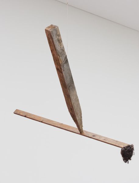 Curator: Jannis Kounellis, born in 1936, created this arresting work titled "Bells," currently held in the Tate Collections. It features wood, steel, and those beautiful, evocative bells themselves. What strikes you first about it? Editor: The precariousness. It looks like a construction site paused mid-task, or maybe something ancient collapsing. The bells, hanging like solemn fruit, feel like a lament. Curator: Kounellis often used industrial materials to create a sense of displacement. The bells, though, suggest a connection to ritual and history, creating a tension. Editor: Absolutely, the bells introduce such a potent symbol! Perhaps referencing the power of institutions, or the potential for social change and collective action. Curator: I always felt they spoke to a personal history, almost like echoes of a forgotten village, resonating within this cold, modern structure. Editor: It's a powerful dialogue between the personal and the political, the raw and the refined. I love how Kounellis invites us into that space of questioning and uncertainty. Curator: It makes you think, doesn't it? Editor: Indeed. And to listen, for echoes in the present.