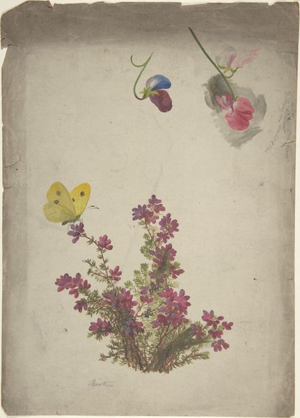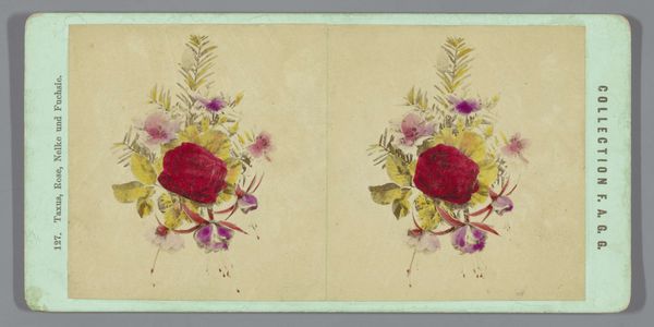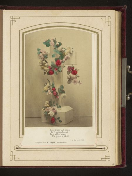 Editor: This photomechanical print, "Fotoreproductie van (vermoedelijk) een tekening van een met een bloemenkrans versierd kruis met daaronder dichtregels van P.A. de Génestet," dates to around 1870-1890. The central image is a cross adorned with roses, it's so visually simple and somewhat melancholy in tone. How would you interpret this work formally? Curator: Initially, the composition strikes me. A stark, geometric cross provides the structure. The floral arrangement, while delicate, serves to frame and soften the rigidity. Note the careful arrangement of colors—the stark white of the cross balanced against the darker tones of the leaves, and then punctuated by the saturated reds and varied pastels in the roses. The photograph’s own tonal range adds another layer. The fading and desaturation contribute to an overall effect. Editor: So, you see the structure as almost a dialogue between the rigid and the organic? Curator: Precisely. Look how the light models the form of the cross, giving it dimensionality, in direct contrast to the flat, graphic quality of the printed poem below. The relationship between line and volume are especially critical in a piece like this. The textures are implied through the printing process, allowing the flowers a slight blurring that adds to that softness. The stark typography grounds the composition as a memorial object. What meaning emerges through that formal juxtaposition? Editor: It's interesting how you focus on the purely visual elements, how they interact with one another without looking outside the image for meaning. I can definitely see the tension and balance you're talking about now, and appreciate that. Curator: Indeed. These formal elements invite further exploration into function and purpose, and by observing such visual strategies, new potential avenues for interpretations arise.