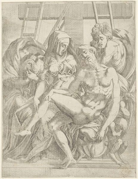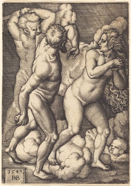 Curator: Ah, there's something so evocative about this piece! This is Giulio Bonasone’s "Apollo and Leucothea, from 'The Loves of the Gods'," made between 1526 and 1536. Editor: Intimacy cast in steel! Look at the musculature rendered so starkly. And is that Cupid interfering or…celebrating? Curator: Interfering feels closer to the mark, perhaps adding a layer of playful chaos! Notice the medium: it’s an engraving, a print, meticulously rendered. Editor: The process alone is captivating. Imagine the labour! The cross-hatching to create shadow, the planning of the plates. These engravings elevate craft to the realm of the divine. The lines aren’t just lines; they're controlled force. How was this image meant to be disseminated and consumed? Was it aimed for the wealthy or produced on a mass scale? Curator: Well, prints like these circulated widely, popularizing classical themes and making them accessible to a broader audience. But it also served to elevate the status of the artist, right? To establish his place within the intellectual currents of the time. This interpretation of Ovid places sensuality alongside virtue. The interplay feels deliberate and staged. Editor: Staged intimacy sold en masse? That puts the whole scene in such a modern context! And here it is on display for the public – it’s had such a varied existence across so many owners and spaces, what does it all mean for its significance? Curator: Meaning layered upon meaning! What I see is Bonasone exploring the tension between human desire and the weight of mythology, forever caught between earthly indulgence and symbolic resonance. Editor: An impressive tension created by sheer determination and focused skill. Makes you respect the possibilities and legacy of reproductive art. Curator: Absolutely. It’s a complex tale spun with ink and passion. Editor: The journey of material, from mind to press to museum, echoes its own kind of epic!