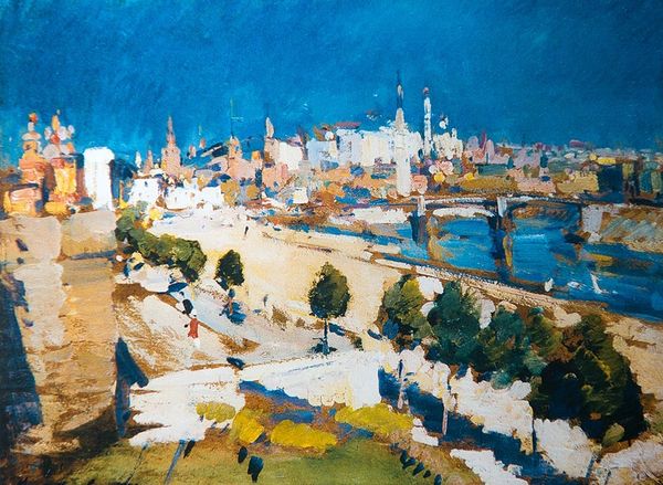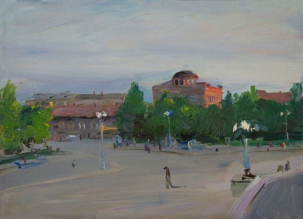 Editor: Here we have Jeff Jamison’s *Holy City Morning*, an oil painting, seemingly of a cityscape at dawn. I’m struck by how the light softens everything, almost blurring the edges of buildings. What do you see in this piece, especially considering its potential context? Curator: I see a landscape deeply intertwined with power and its visual representation. The painting presents us with a seemingly tranquil cityscape, but the dominant, almost monumental, church steeple immediately raises questions. How does the architectural dominance of religious institutions reflect and reinforce societal hierarchies? Consider the historical role of the church, particularly in relation to race and class. Editor: That's an interesting point. I hadn't considered the steeple's dominance in that way. Are you suggesting that the beauty of the landscape might mask deeper issues? Curator: Precisely. The painterly style, reminiscent of Impressionism, romanticizes the scene, perhaps obscuring the complex social realities embedded within. How might we interpret this ‘holy city’ in light of its history of inequality and oppression? Does the artist grapple with these complexities, or does the work simply offer a picturesque view? Editor: So, looking beyond the immediate aesthetic, we should ask what the artist omits or perhaps even unintentionally reveals? Curator: Exactly. By critically examining the composition, the choice of subject matter, and the artistic style, we can unpack the ideologies embedded within the artwork. Can this "holy city" truly exist without addressing historical and present injustices? The painting then becomes less a celebration and more a question mark. Editor: I never would have thought to look at a pretty landscape in such a critical way. I guess there's always a story behind the surface, isn't there? Curator: Absolutely. And questioning that surface is crucial to understanding not only art but the world around us. It challenges us to reconcile beauty with truth.