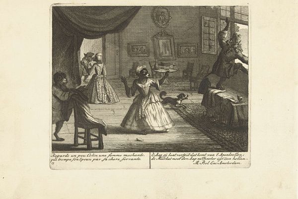 In 1716, Matthijs Pool created this engraving titled "Apen in de hedendaagse mode van rokken met baleinen," or "Monkeys in the contemporary fashion of skirts with whalebone." The print satirizes the aristocracy in the Netherlands during the early 18th century. Here, Pool deftly uses the figure of the monkey to mock the excesses and vanities of the upper class. The scene buzzes with the chaos of a noble gathering. Monkeys dressed in elaborate gowns and suits mimic human behaviors; they play music, flirt, and posture affectedly. This representation cleverly critiques the superficiality and moral corruption that was often associated with the wealthy elite. Such satirical works provided a means of social commentary, reflecting the growing discontent with the social hierarchy of the time. The emotional undercurrent is one of mockery mixed with a sharp observation of human folly, inviting us to reflect on the behaviors we see mirrored in these simian figures.