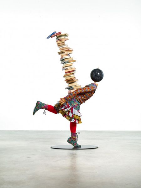 Yinka Shonibare’s *Girl Balancing Knowledge III* uses fabric and books to create a striking image. The dress, a vibrant mix of turquoise, red, yellow and blue, is made from Dutch wax fabric. It's a bit like a painter choosing their colors, a deliberate choice to tell a story. The books piled high on the figure's head are such a visual metaphor for the weight of knowledge. The fabric has such an amazing tactile quality, you can imagine running your hands along the colorful patterns. Notice the way the fabric drapes. It's not just about the pattern; it's about how the material falls and folds, creating shadows and highlights that give the sculpture depth and movement. That physical presence is what makes the piece so captivating. Shonibare's work reminds me of someone like Jeff Koons. Both play with scale and materials to question value and cultural identity, but Shonibare brings a more pointed commentary on colonialism and its impact. Ultimately, art is a conversation, a dialogue across time and cultures.