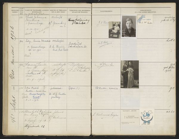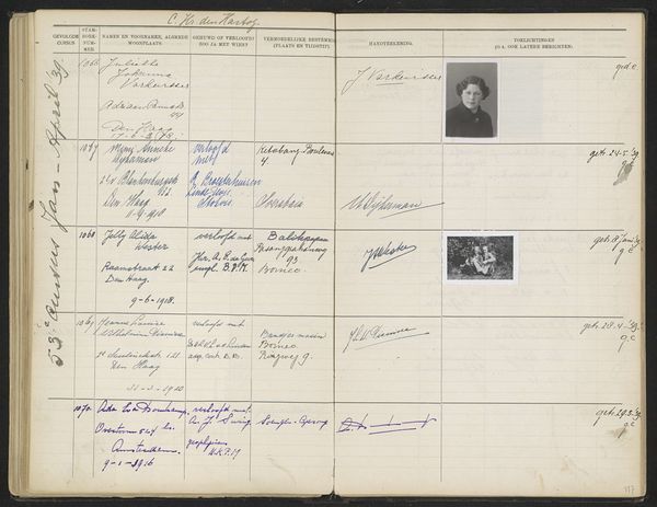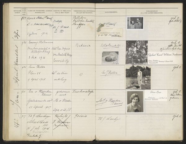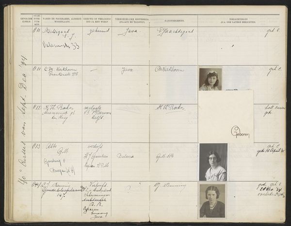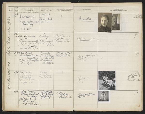 Editor: This is a page, Blad 62, from a register titled "Stamboek van de leerlingen der Koloniale School voor Meisjes en Vrouwen te 's-Gravenhage," or Register of Students of the Colonial School for Girls and Women. It dates from sometime between 1930 and 1949 and appears to combine photography and print on paper. It gives me a documentary feeling, almost like looking through an old yearbook or registry. What can you tell me about its importance? Curator: This work presents a compelling intersectional narrative, hinting at the complexities of colonial education and gender roles in the early 20th century. The colonial schools trained women with skills applicable to colonial society, so each name and portrait here can be seen as an artifact representing individual ambition and larger systemic power dynamics. Who were these women, and what roles were they expected to play in the Dutch colonies? Editor: So it's less about the artistic style, which seems pretty straightforward, and more about the historical context? Curator: Precisely. The stark format, almost bureaucratic in its presentation, invites us to consider the experiences of these young women who attended this school. Consider the mixed-media aspect: How do the albumen prints disrupt the print’s structured formality? What stories do these portraits, frozen in time, whisper about identity, expectation, and agency? Editor: That is thought-provoking. I hadn't considered how much the very format of the page could be saying. Thanks for opening my eyes to that. Curator: Absolutely. The real value here is thinking critically about how institutions shape individuals, and how individual stories reflect broader sociopolitical currents. This blend of record-keeping and individual portraits makes it a powerful testament to a particular time.