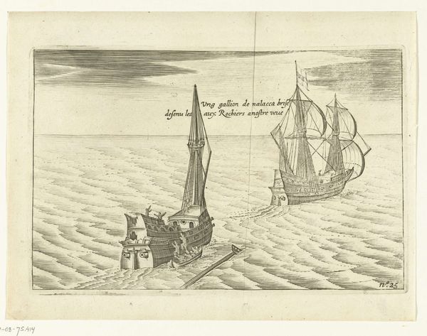 Curator: Looking at "De Mauritius zinkt het Spaanse schip in de baai van Manila, 1600," created between 1601 and 1646 by Benjamin Wright. It's a striking drawing rendered in ink, a print that captures a very specific historical moment through a distinct baroque lens. Editor: Immediately, I'm struck by the precarious angle of the sinking ship – that desperate tilt towards the depths really conveys a feeling of finality, like watching a giant slowly kneel. Curator: Exactly. The depiction offers us insight into the naval conflicts between the Dutch and the Spanish. Note the sharp lines of the engraving – consider how this method of reproduction made images of such events accessible, effectively disseminating political and military information. Editor: The chaos of the sinking contrasts so starkly with the comparative stability of the other vessel. The tiny figures jumping overboard adds to the frantic mood. It’s incredible how much drama Wright could distill with such spare means – the very fine lines even suggest the spray of the sea. Curator: And this brings up the material conditions that made this print possible – paper, ink, and the skilled labor of the engraver were all commodities embedded within trade networks shaped by global conflict. Each line is also a trace of the colonial era power dynamics it depicts. Editor: It’s hard not to feel a pang of empathy, despite knowing the context of colonial struggle. I see myself among the tiny men in the sea. Curator: I think that reflects the print's enduring power; it invites us to consider the human cost embedded within these grand narratives of conquest and empire. The drawing encapsulates the moment. Editor: Yes, the immediacy. I wonder, when gazing at this dramatic scene, if the artist ever pondered the countless stories swallowed by the sea, and that continue to emerge.