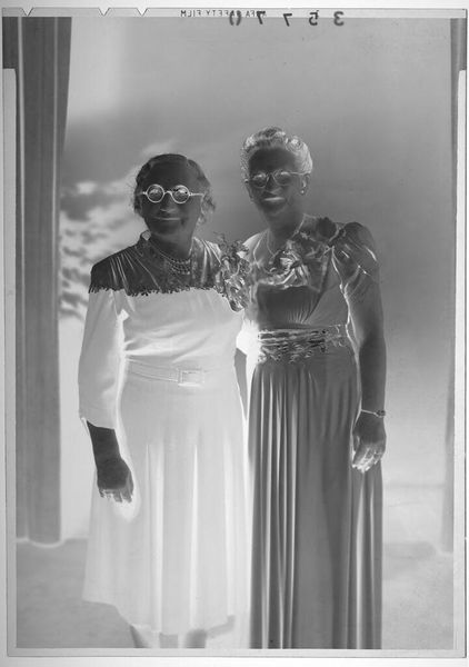 Editor: So, this is an untitled photograph by Martin Schweig depicting a bride and groom in front of a staircase. The high contrast gives it a theatrical feel. What sociopolitical narratives do you see at play here? Curator: The stark contrast and formality immediately suggest a negotiation of power and representation. Consider the historical context: how might race, class, or gender intersect within the institution of marriage in this time period? Editor: That's a really interesting angle. I hadn't thought about the power dynamics so explicitly. Does the lack of title play into that interpretation? Curator: Absolutely. The absence of a title can be a deliberate act, leaving space for viewers to project their own understanding and biases onto the image. What feelings does this evoke in you? Editor: A sense of both elegance and constraint, which I guess is fitting considering your reading of it. Thanks, that really opened my eyes! Curator: And yours have reminded me that art's power lies in sparking these very dialogues.