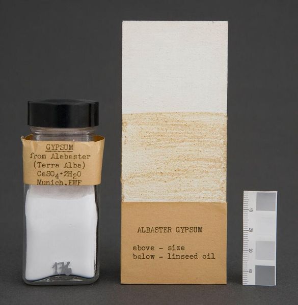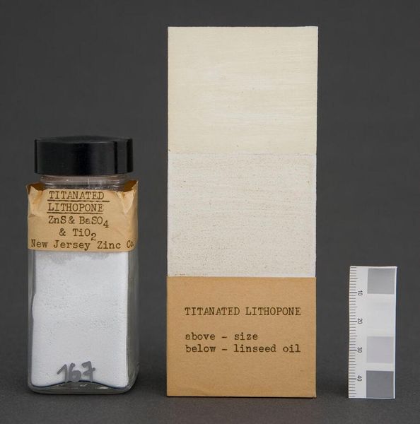 Curator: Here we have "Titanium Dioxide," a manufactured pigment sample from the Titanium Pigment Corporation. At first glance, it seems like a mundane object. Editor: Yet, the striking white radiates purity and potential. It's almost blinding in its intensity. Curator: Exactly, and that's key! Titanium dioxide revolutionized paint production. Its superior opacity and brightness transformed everything from art to architecture. Editor: White, of course, has always been a symbol of cleanliness, divinity. Here, it's almost aggressively modern, detached from its traditional associations. Curator: In a way, it democratized whiteness, making it industrially reproducible, readily available. It speaks to shifts in consumer culture and industrialization. Editor: So, this simple jar represents a significant turning point in visual culture. Quite a statement. Curator: Indeed.