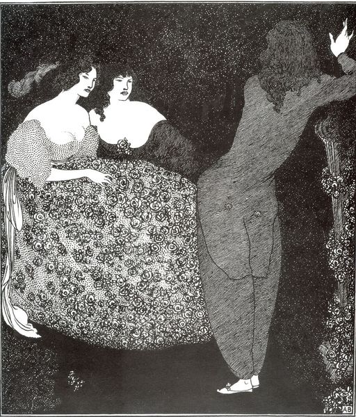Editor: This is Aubrey Beardsley's "A Nocturne of Chopin," housed at the Harvard Art Museums. It’s quite small. There's a dreamy, almost unsettling quality to it. What do you see in this piece? Curator: It's a dance of decadence, isn't it? Beardsley, even in his own time, was pushing boundaries. Look at the sharp contrasts and those figures—are they real, imagined, or a bit of both? A visual poem, if you will, set to Chopin. Editor: A poem…that's a great way to put it. It feels like it's open to so many interpretations. I guess I just expected something a little more straightforward. Curator: Ah, but where's the fun in that? The beauty lies in its mystery, its willingness to let us wander through the shadows of our own minds. Beardsley invites us to dream, and perhaps to question what we think we know. Editor: That’s really inspiring. I’m going to look at Beardsley with a whole new perspective now.